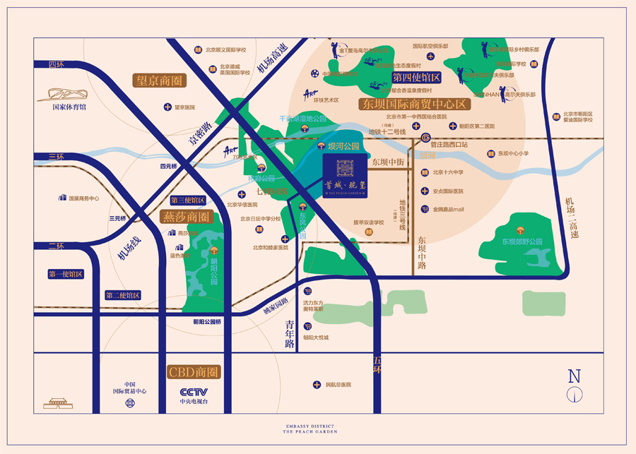 首城珑玺位于北京五环七棵树出口向北约300米,处在东坝第四使馆区、国际商贸中心核心,项目周边商业、公园、湿地、医疗、学校等配套成熟。
